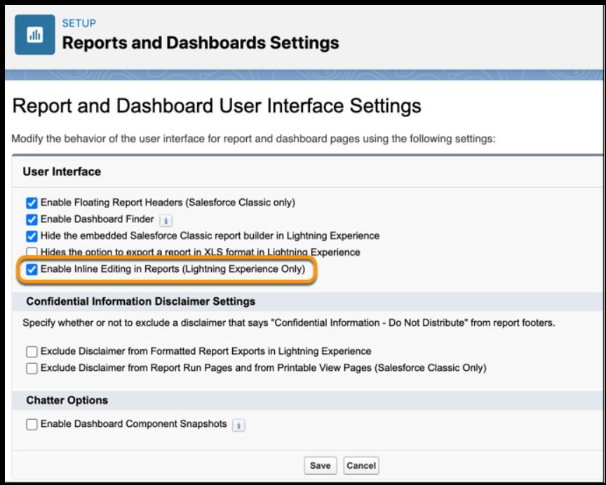 - Nach Freigabe von Salesforce, können Sie im Setup unter Einstellungen zu den Berichten und Dashboards gehen und das Kontrollkästchen für die Inline-Bearbeitung aktivieren.