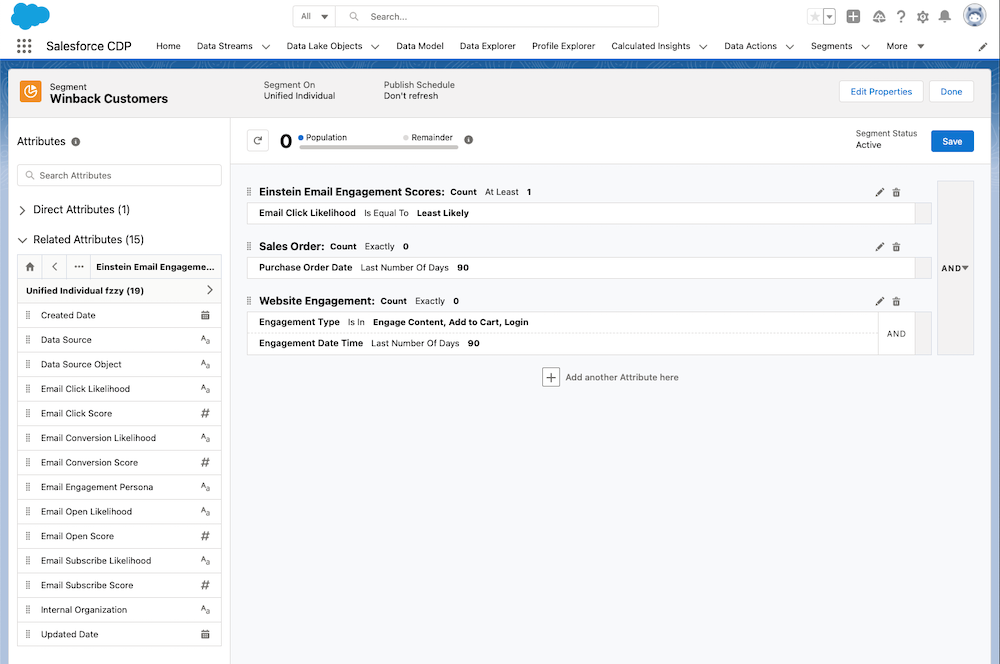 Das Einstein Scoring in Salesforce CDP verhilft zur Verwendung von KI mit cloudübergreifenden Daten um so auch immer die aktivsten Abonnenten ansprechen zu können und so mit diesen auch in Interaktion zu treten. Hierbei können zum Beispiel auch Kunden ausgeschlossen werden, die nicht mit Mails oder Mobilgeräten agieren und so andere Kanäle berücksichtigt oder priorisiert werden.