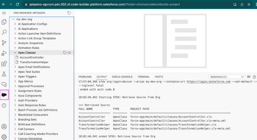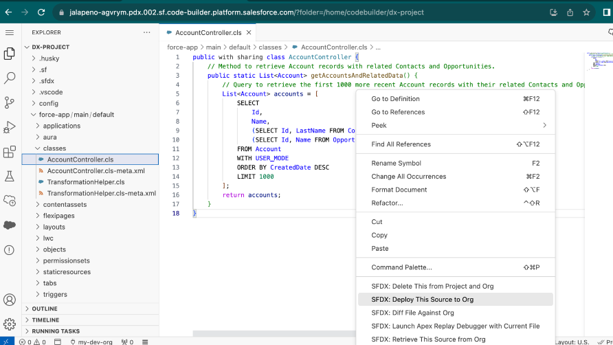 Code Builder: Perfekt ausgestattet für Apex, SOQL und LWC. Bietet umfassende Autovervollständigungs- und IntelliSense-Funktionen, parallel zu Salesforce Extensions für VS Code. Direkte Erstellung, Bewertung und Bereitstellung von Änderungen an Apex-Klassen und Lightning-Webkomponenten im Webbrowser.