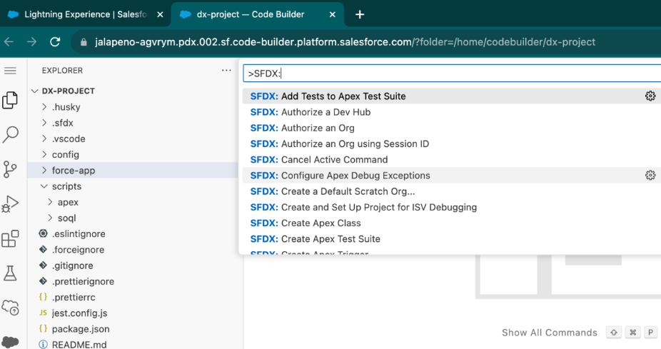 Dank des aktuellen, vorinstallierten Salesforce-Befehlszeilentools (sf v2) ist das Code Builder-Terminal einsatzbereit. Entwickler können problemlos sämtliche Salesforce-CLI-Befehle ausführen und sogar Plugins von Drittanbietern für die Salesforce-CLI installieren. Der Zugriff auf das Terminal ist so unkompliziert wie das Umschalten über die Befehlspalette.