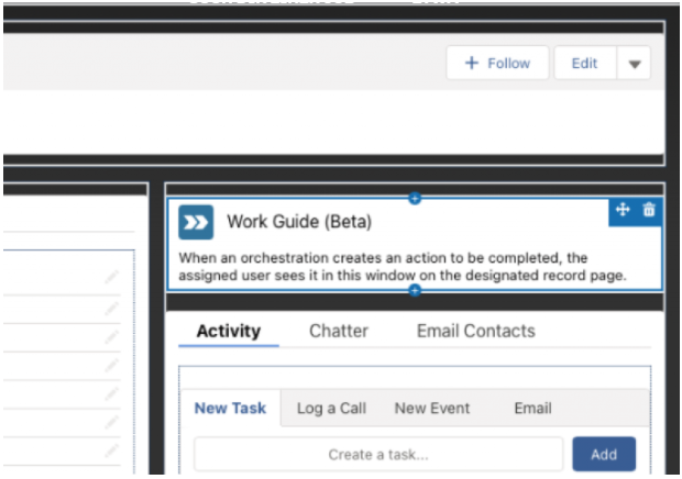 Zuerst müssen Sie den "Work Guide für Flow Orchestrator" zur Lightning-Seite hinzufügen. Sobald Ihnen ein interaktiver Schritt zugewiesen wurde, können Sie zur Work-Guide-Komponente navigieren. Hier können Benutzer auf ihre zugewiesenen Bildschirmabläufe zugreifen.