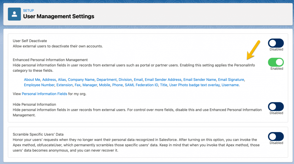 Salesforce verabschiedet mit der Winter´23 die alte Sicherheitseinstellung, wodurch nur 10 Benutzerfelder geschützt werden konnten. Mit der neuen „Enhanced Personal Information Management“ erhalten Sie ein sichereres Framework zum Schutz personenbezogener Daten (PII) externer Benutzer und können bis zu 20 Felder sichern.
