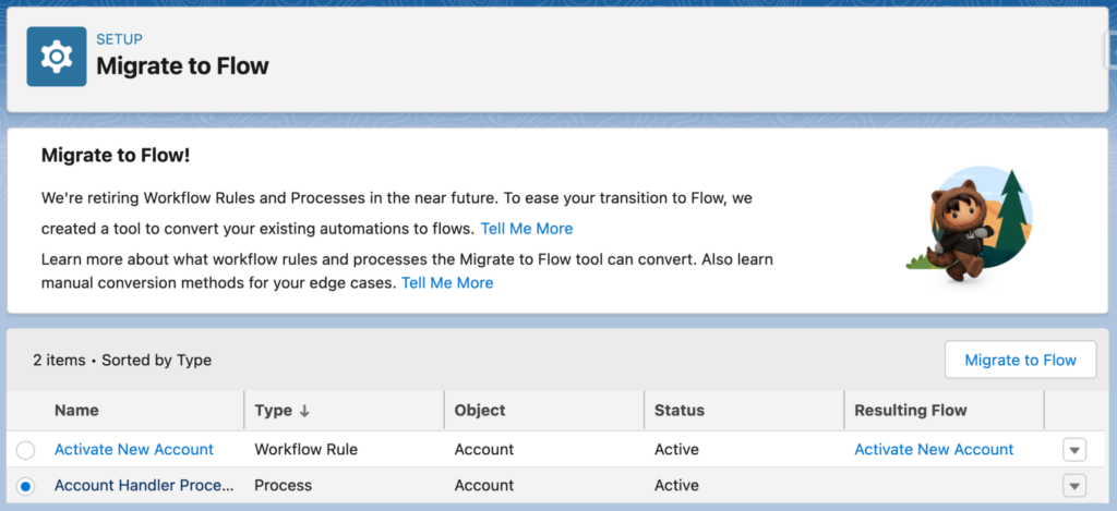 Migration von Process-Builder-Prozessen zum Flow: Salesforce hat vor einiger Zeit das Tool "Zu Flow migrieren" eingeführt. Vor der Version Spring '23 konnten nur Workflowregeln migriert werden, nun können Sie mit demselben Tool auch Ihre Prozesse aus dem Process Builder migrieren. Suchen Sie im Menü Setup "Zu Flow migrieren" und wählen Sie den von Ihnen ausgewählten Prozess.