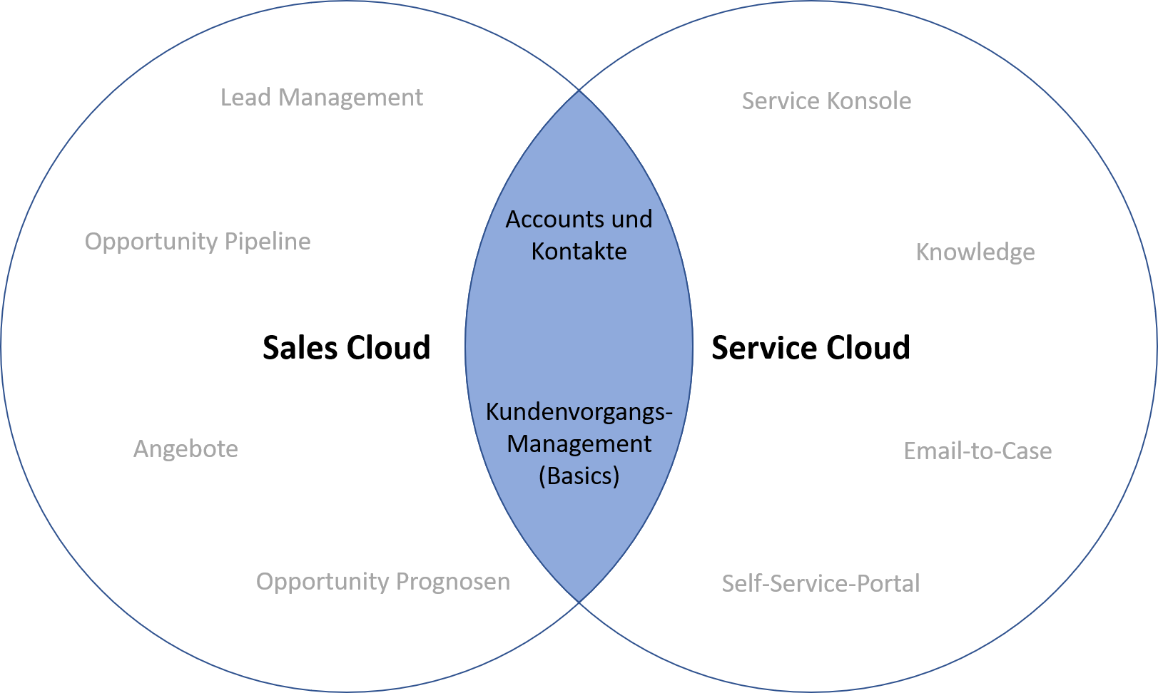 Es gibt eine Überschneidung zwischen den beiden Cloud Anwendungen. Beide Anwendungen nutzen Accounts und Kontakte, sowie die Basics zu den Kundenvorgängen.